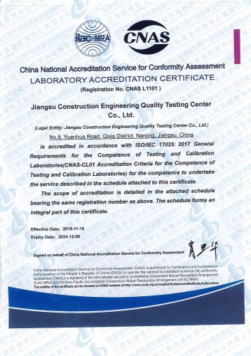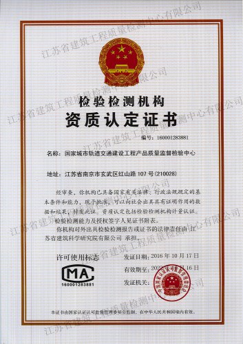 國家城市軌道交通建設工程產(chǎn)品質(zhì)量監(jiān)督檢驗中心, 依托江蘇省建筑科學研究院和江蘇省建筑工程質(zhì)量檢測中心在城市軌道交通建設工程領域的綜合技術優(yōu)勢,于2016年10月獲得國家認證認可監(jiān)督委員會批準授權..